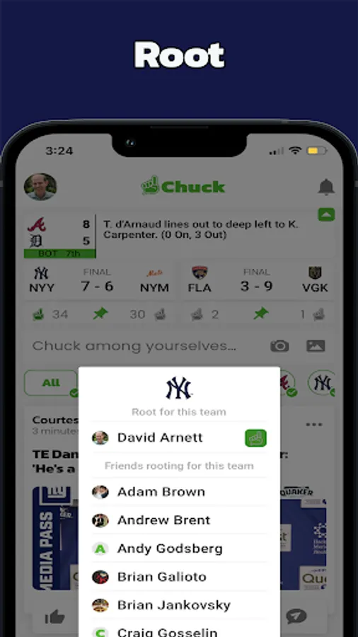 Chuck combines everything that’s happening in the sports world—scores, news, updates and more—with the banter of your text threads, tailgate or table.