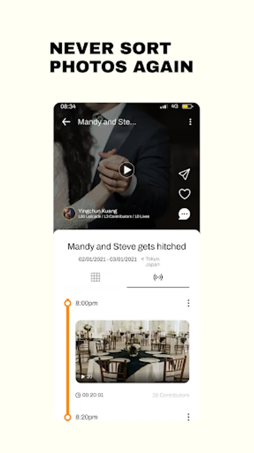 Upload your images in batches and let our app automatically sort it out into a timeline for you. Never sort your media files again. Easily share a QR Code or link for your event attendees to easily contribute media files to your memory. No more manually chasing everyone to pass you their photos and videos. View live events from the multiple views/angles of fellow attendees live streaming at your event. It’s time to store and relive your memories in a more hassle-free and meaningful way