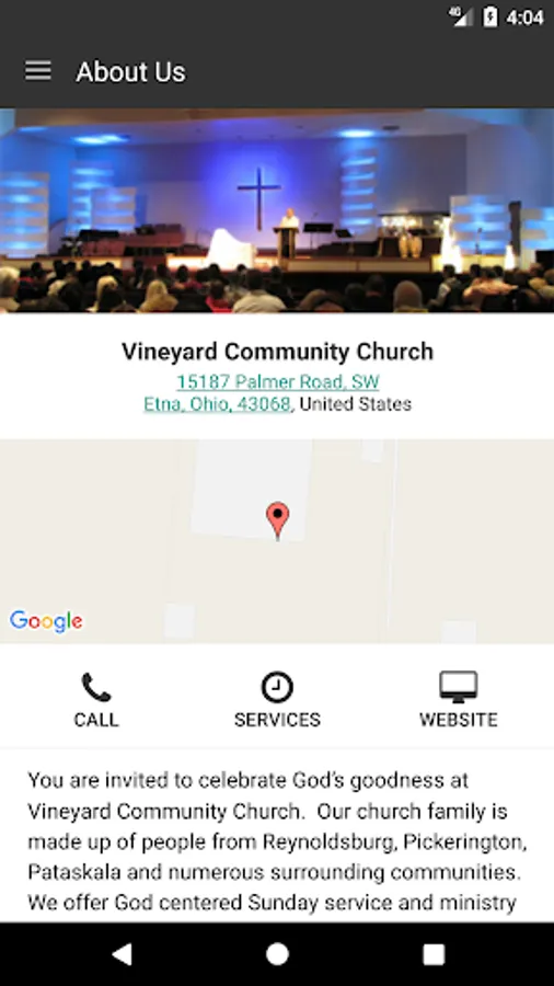 Vineyard Community Church in Etna/Reynoldsburg is now mobile. Access our sermon video or audio, event lists with registration, bible blog, online giving and more. Vineyard Community Church is located in Etna, Ohio on the edge of Reynoldsburg. Our church family is made up of people from Reynoldsburg, Pickerington, Pataskala and numerous surrounding communities. We offer God centered Sunday service by Ps. Dave DiYanni and ministry throughout the week for the whole family.