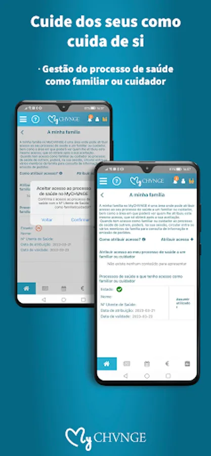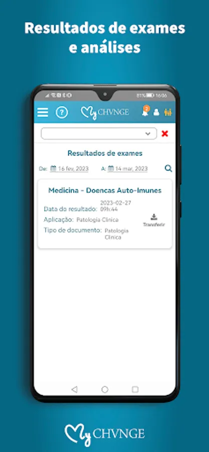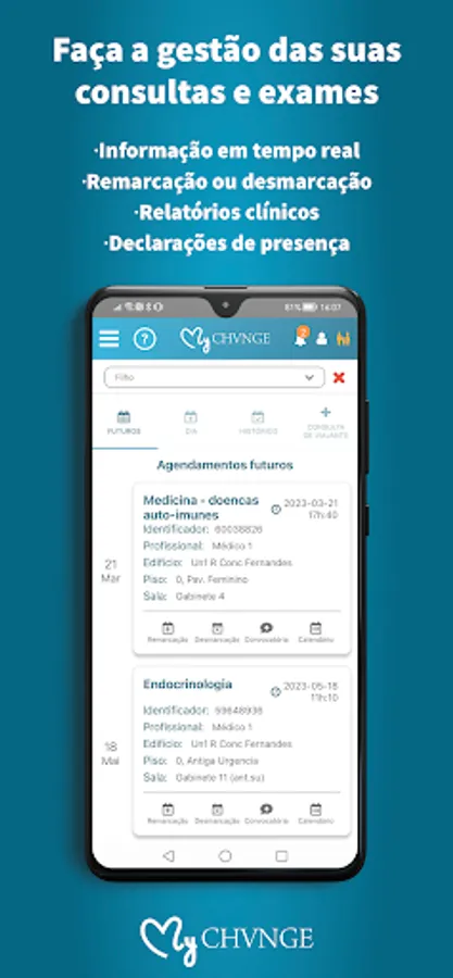 Your health in the palm of your hand. Through MyCHVNGE, you can manage appointments, access exam results, register for appointments or exams, download attendance statements, request clinical reports, consult time and waiting lists, both for yourself and your loved ones.