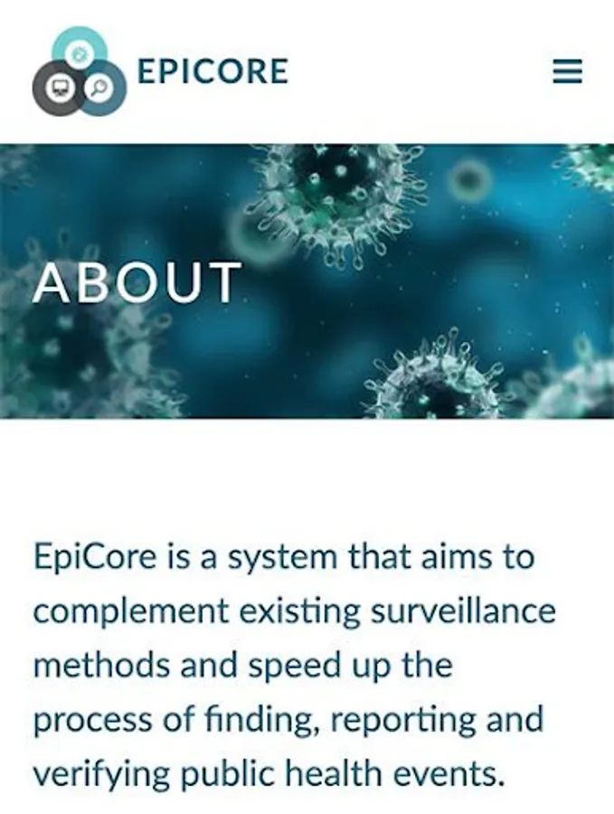 EpiCore is a virtual community of health professionals using innovative surveillance methods to verify outbreaks of infectious diseases. It is an innovative system that aims to complement existing surveillance methods and speed up the process of finding, reporting and verifying public health events. It uses a worldwide network of health experts that, through a secure online reporting platform, have the opportunity to provide information about ongoing public health events. Members are potentially contributing to a faster public health response of communities and health organizations involved at local and international levels. The EpiCore app features public infectious disease event summaries. EpiCore members will be able to access the responder dashboard.