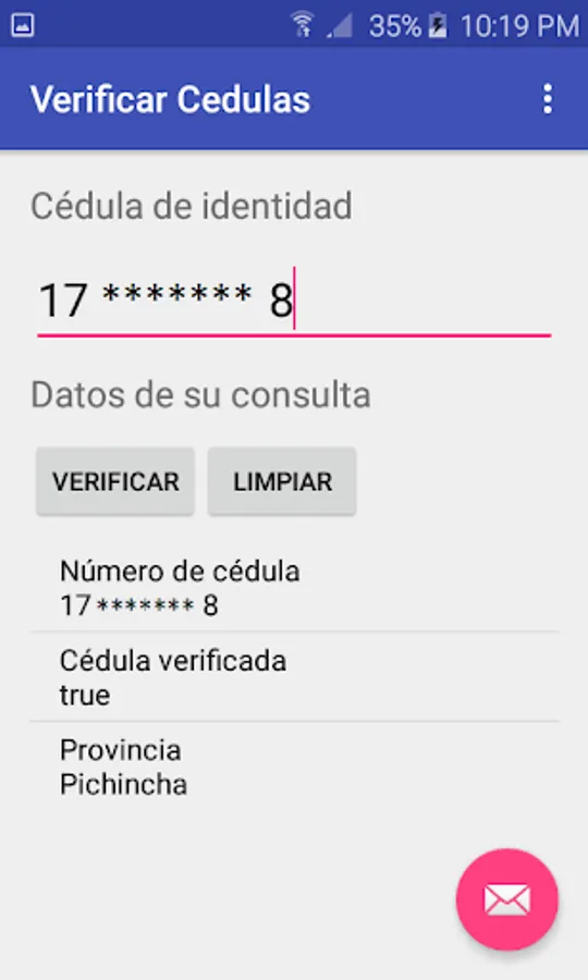 With this application you can check whether a number of Ecuadorian identity card is true or false and province of issue.