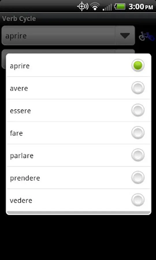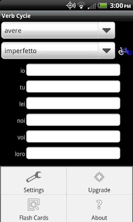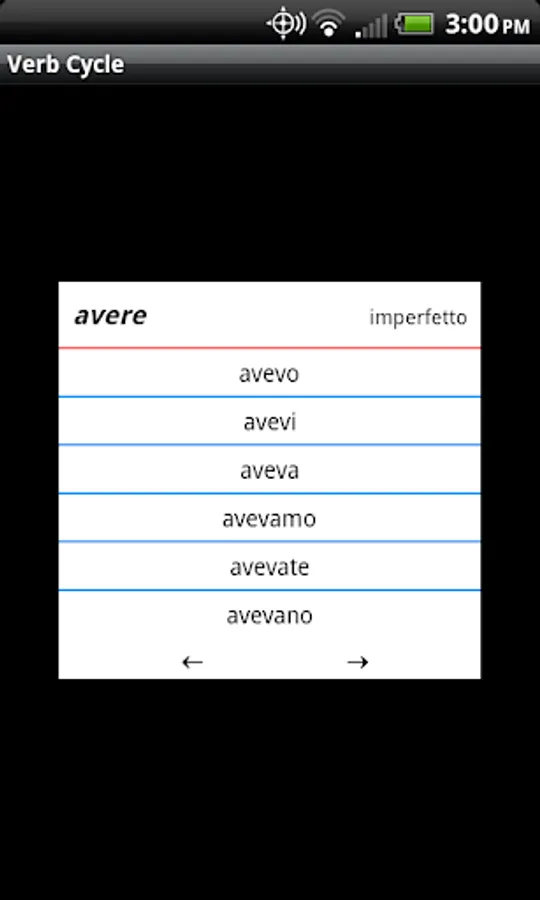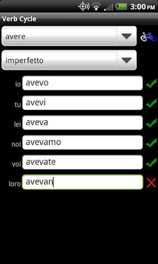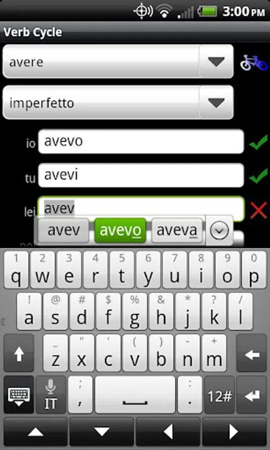 Verb Cycle Italiano helps you improve your fluency in the Italian language through verb conjugation drills. Test your knowledge of the conjugations in each of the 15 tenses. Using your touch screen, enter the conjugation for each of the subject pronouns (io, tu, etc). Verb Cycle checks your response and displays a green checkmark when your response is correct. If the response is incorrect, a red "X" is displayed. You can touch the red "X" to have Verb Cycle provide the correct conjugation for the pronoun.