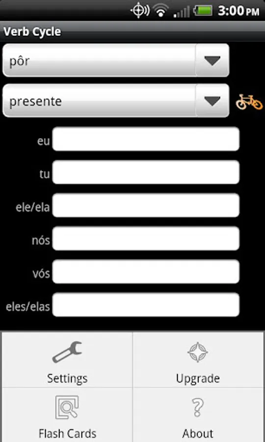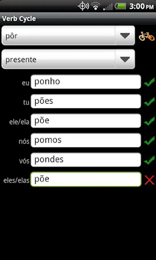 Verb Cycle Português helps you improve your fluency in the Portuguese language through verb conjugation drills. Test your knowledge of the conjugations in each of the 20 tenses. Using your touch screen, enter the conjugation for each of the subject pronouns (eu, tu, etc). Verb Cycle checks your response and displays a green checkmark when your response is correct. If the response is incorrect, a red "X" is displayed. You can touch the red "X" to have Verb Cycle provide the correct conjugation for the pronoun.