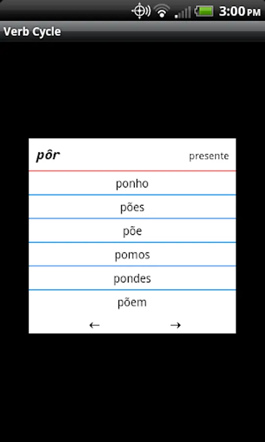 At any time, you can choose the Flash Card menu option, which will display all conjugations for the selected verb and tense. You can click on the left and right arrows to cycle through each tense. Or, you can use a left or right page-turning motion on the flash card to cycle through each tense.