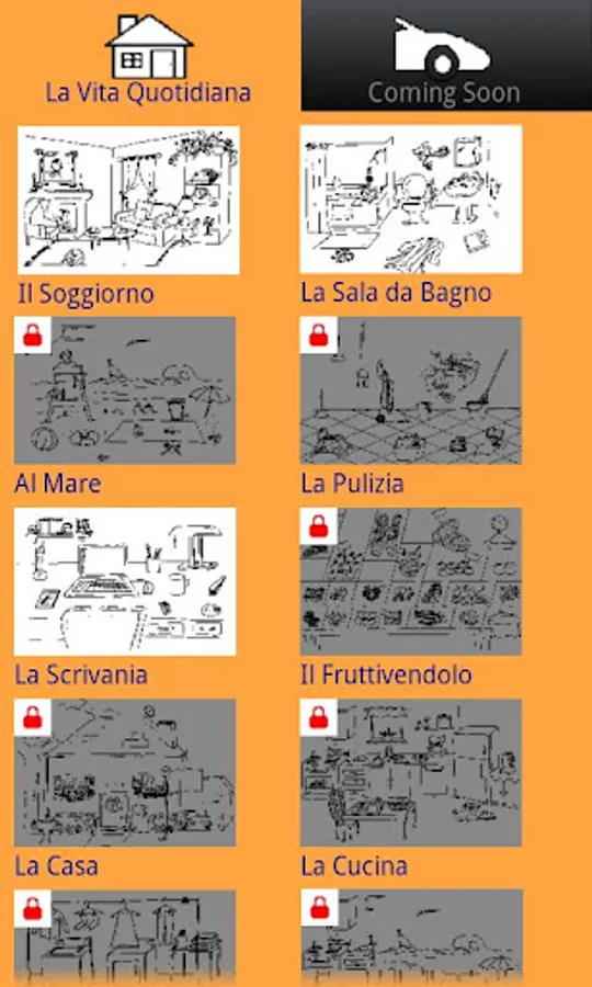 Vocabulent Italiano comes with a Trial version of the «Everyday Living 1» scene pack. More scenes are available in Google play.