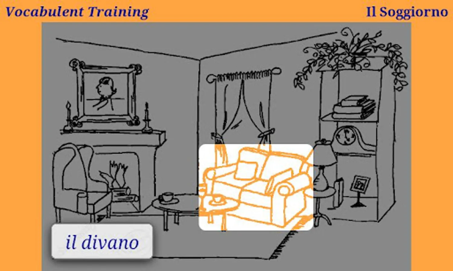 Vocabulent uses "scenes," which are drawings of a typical location or environment. In Training mode, Vocabulent uses pictures and words to teach you the Italian description for items found in the picture. Using your touch screen, you choose an item in the scene. Vocabulent will highlight the object and display it's Italian name or description.