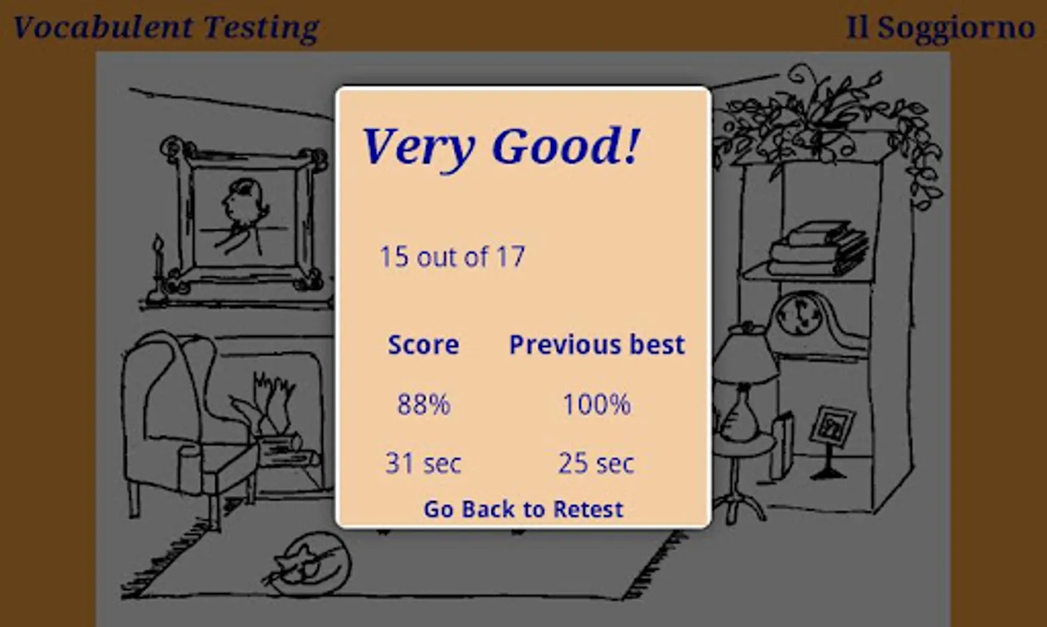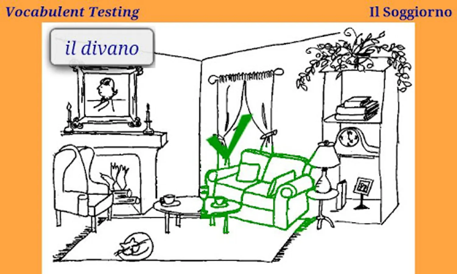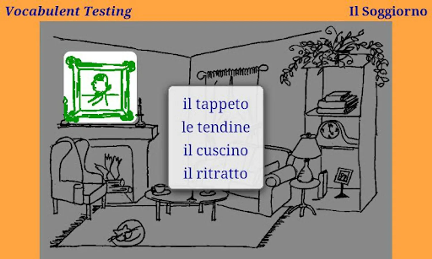 Think you've mastered learning the Italian words for a particular scene? Try Testing mode. Vocabulent will challenge you to choose the correct item by its Italian description. Or select Multiple Choice mode from the options menu to have Vocabulent highlight the item and show you four possible answers.
