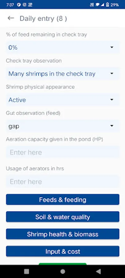 Shrimp farming is technology and inputs intensive production system. Shrimp is a delicate animal and requires optimal rearing conditions for its better survival and growth without any stress. ICAR-CIBA has already developed and launched CIBA ShrimpApp to enhance the capacities of the farmer/end-user on shrimp farming. The farmer has to follow better management practices and monitor the inputs, water quality and behaviour of the shrimp to ensure successful crop. Therefore, CIBA Shrimp Krishi has been developed for the purpose. Through this mobile application the farmer can record all the day-to-day farming operations from day one to harvest and monitor the farm efficiently. The app will provide the survival, FCR, biomass, expenditure incurred and alert the farmer whenever deviations are noticed in water quality, FCR and animal health. Further, the farmer can share his farm data to his consultant or a scientist for technology advisories.