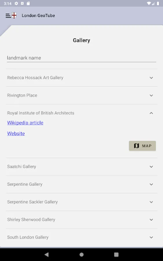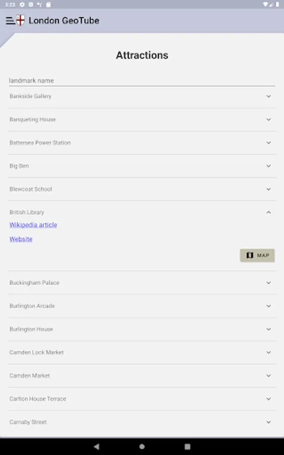 - Lists of landmarks available for tourists and visitors displayable on the map.