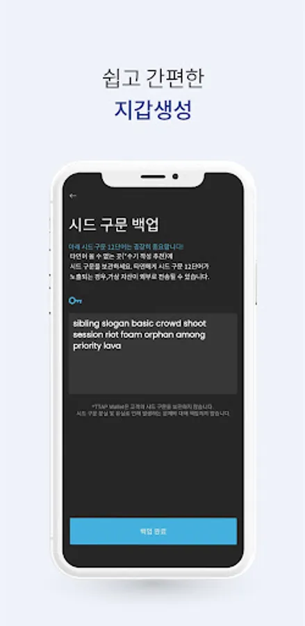 - 고객의 시드 구문을 별도의 서버에 보관하지 않고, 사용자의 개인키를 완벽하게 보호하는 고급 보안 메커니즘이 사용되었습니다.- 모든 디지털 자산은 프라이빗 키로 관리되며, 복구 시 시드 구문을 통해 모든 코인 복구가 가능합니다.- 12단어의 시드 구문은 반드시 안전하게 보관하고, 다른 사람에게 노출되지 않도록 조심하세요.
