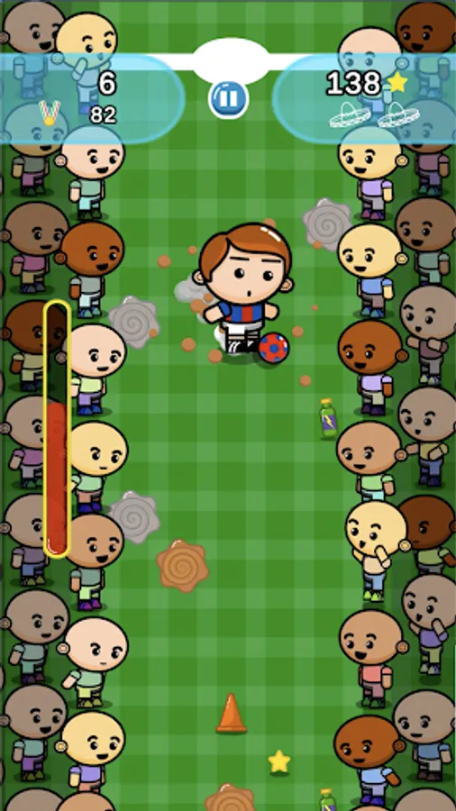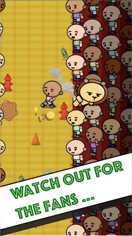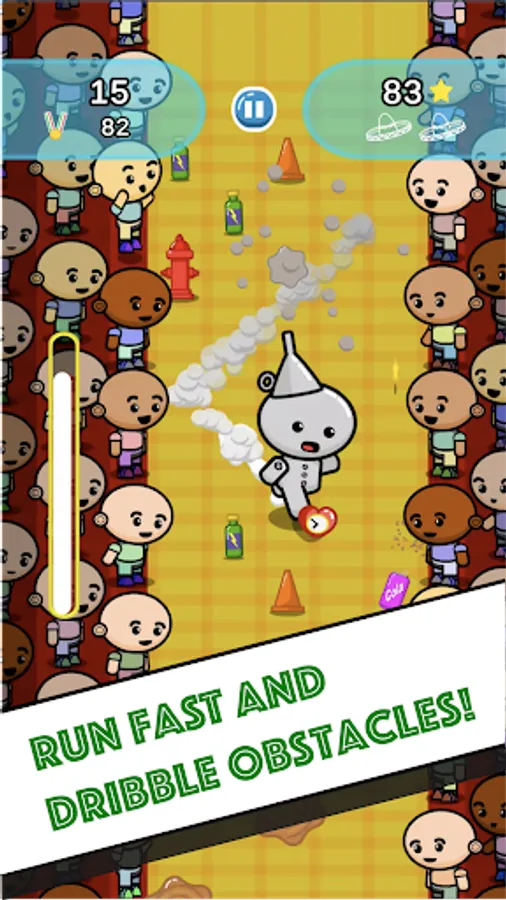 Avoid cones or fire hydrants and especially the fans on the sides of the pitch; beware of puddles you can slip on or mud that can slow you down; Take energy drinks to recover from fatigue, but don't drink the cola that makes you stomach ache! Collect stars that will allow you to resume the game even after tripping!