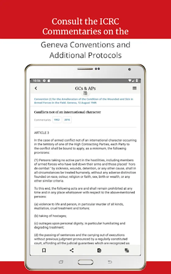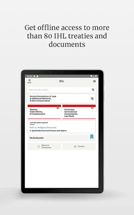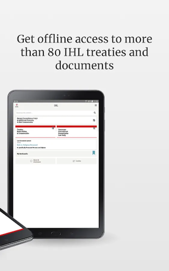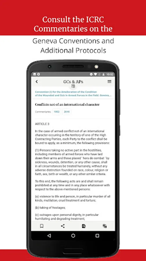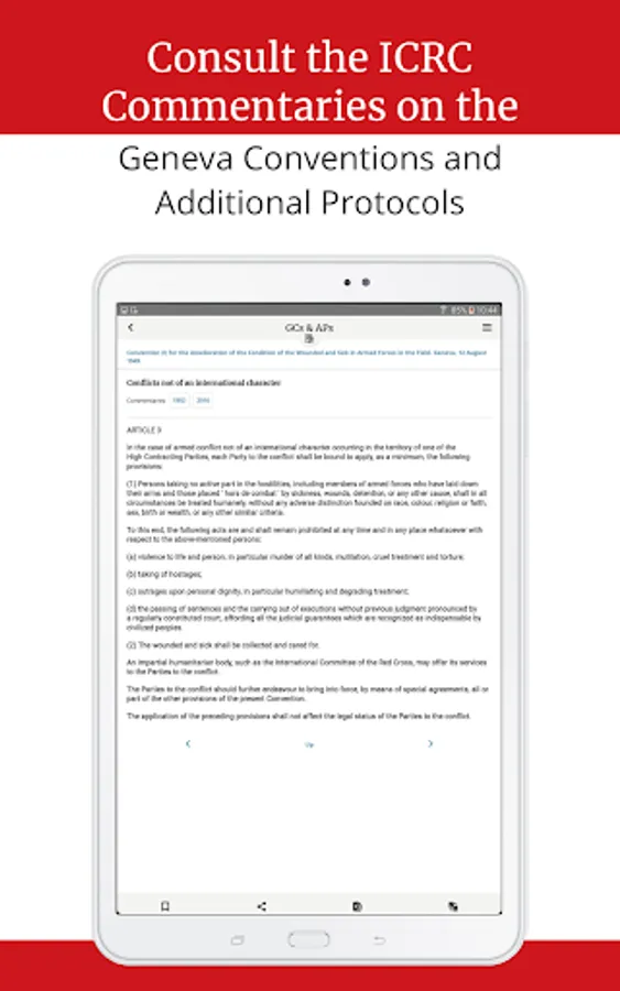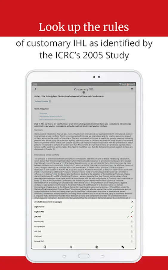 This application (app) provides offline access to more than 80 treaties and other documents relating to international humanitarian law (IHL) – most notably, the Geneva Conventions and their Additional Protocols, the ICRC’s original and updated Commentaries on the Conventions and Additional Protocols, the rules of customary IHL identified by the ICRC’s 2005 study on customary IHL and various ICRC documents on IHL. The app interface can be set to any of the eight languages listed in the settings of the side menu, under “App language”: Arabic, Chinese, English, French, German, Portuguese, Russian and Spanish.