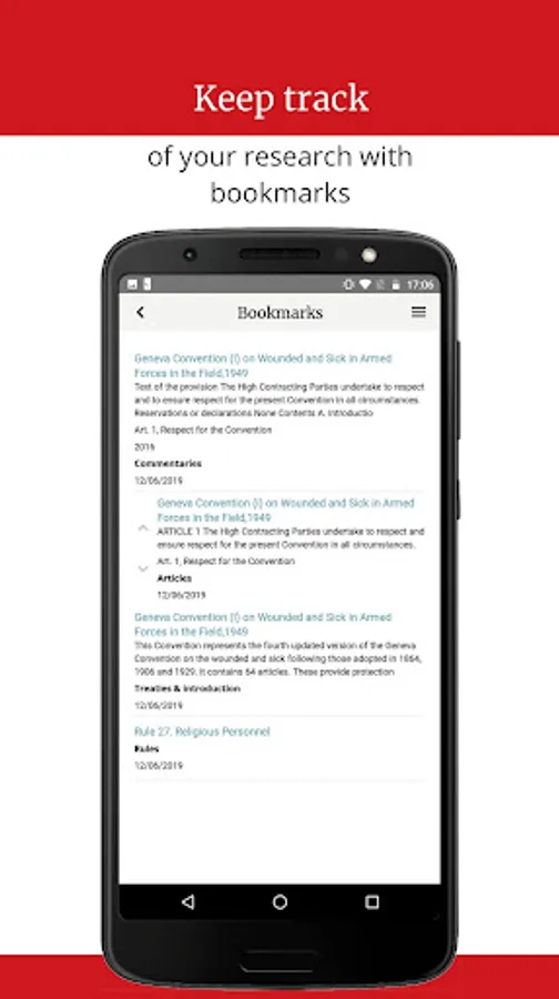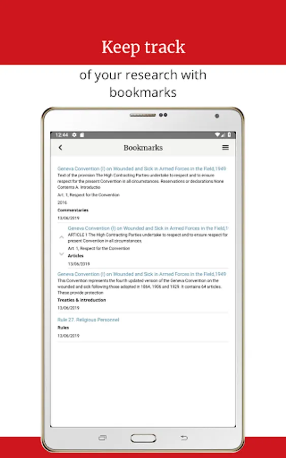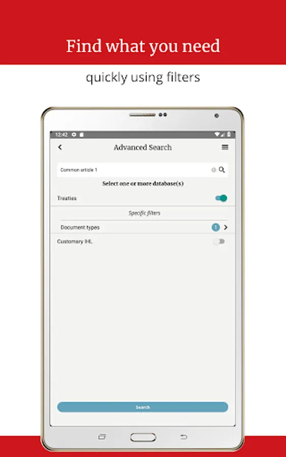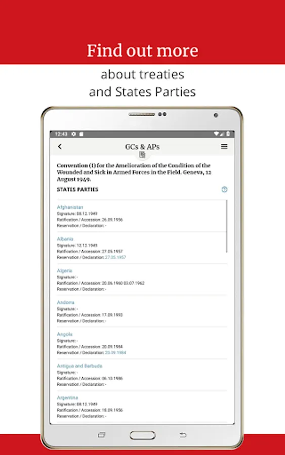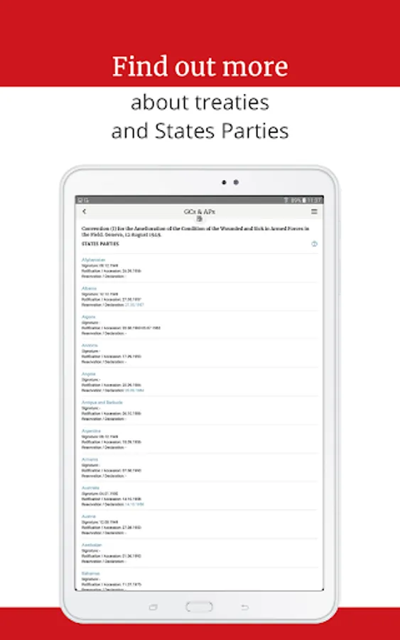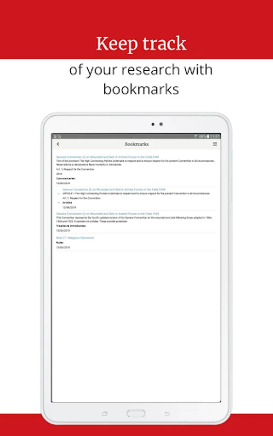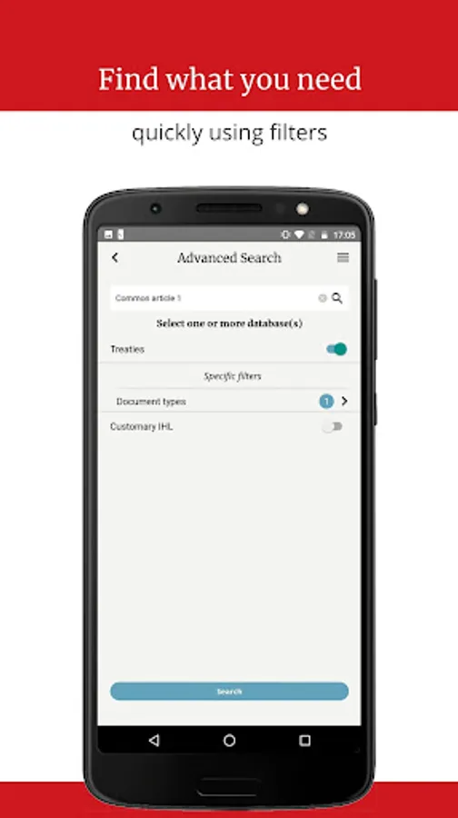 This application (app) provides offline access to more than 80 treaties and other documents relating to international humanitarian law (IHL) – most notably, the Geneva Conventions and their Additional Protocols, the ICRC’s original and updated Commentaries on the Conventions and Additional Protocols, the rules of customary IHL identified by the ICRC’s 2005 study on customary IHL and various ICRC documents on IHL. The app interface can be set to any of the eight languages listed in the settings of the side menu, under “App language”: Arabic, Chinese, English, French, German, Portuguese, Russian and Spanish.