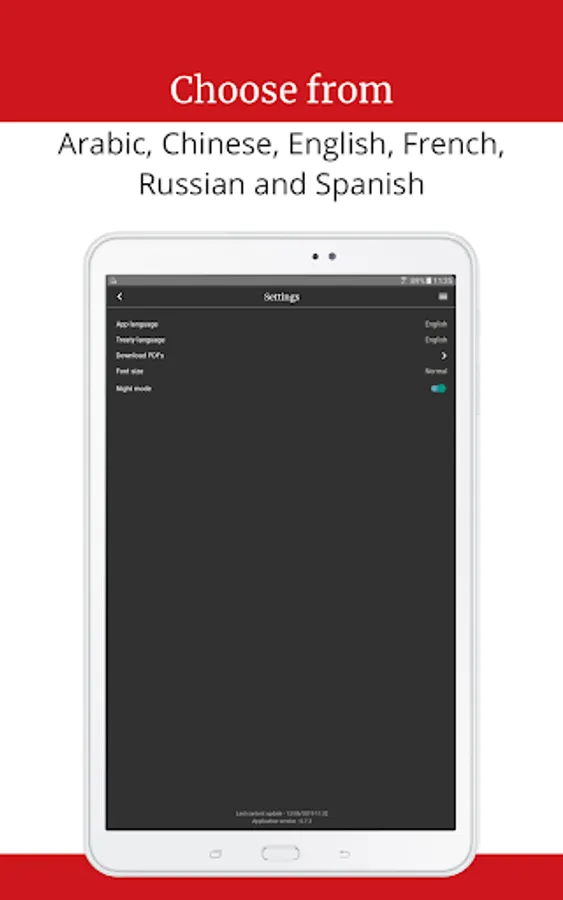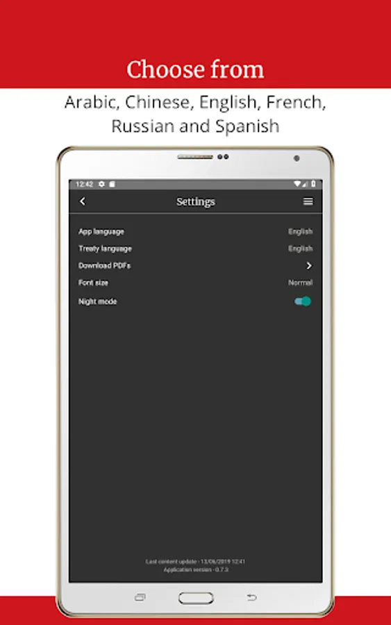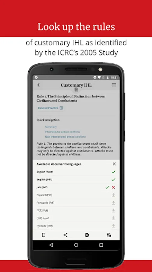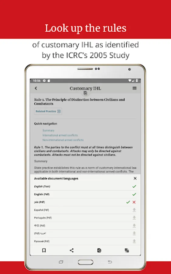PDF versions of treaties and documents, and of volume I (rules) of the ICRC’s 2005 study, can be downloaded in any of the eight languages – provided the text in question has been translated – by tapping the bottom-right icon when in the document. All available PDFs in your device’s language are automatically downloaded when the app is first installed. We recommend installing a separate PDF reader to view files.