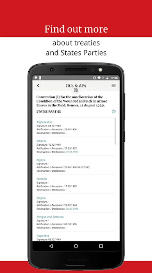 The section on IHL treaties is organized by topic, states parties and date. You can download the list of ratifications in PDF or Excel formats by tapping on “States party to the main treaties” at the bottom of the page. Each treaty has a homepage with an introduction; specific articles can be accessed from this page. The Geneva Conventions and their Additional Protocols are accompanied by the ICRC’s original and updated commentaries. Tapping on “About this text” provides general information about a treaty. If you tap on the name of a state in “State parties”, you are redirected to a list of all the treaties in force for that state.