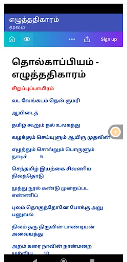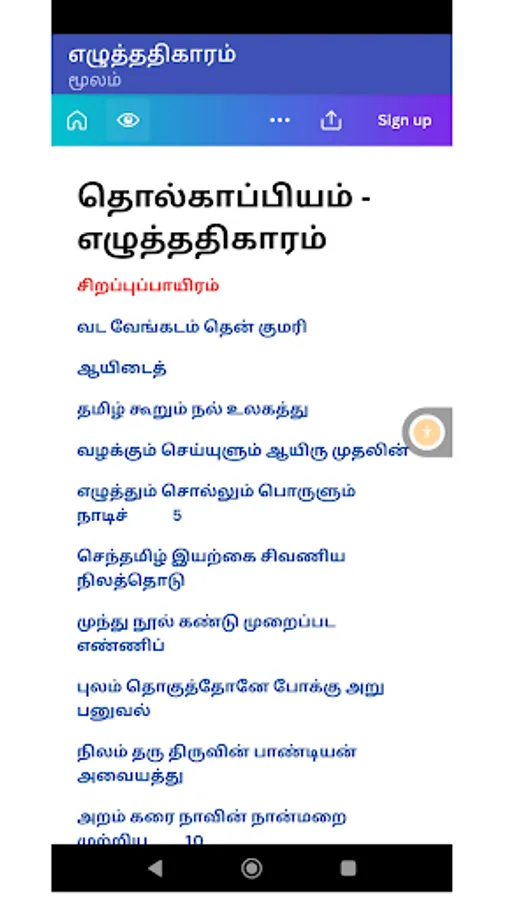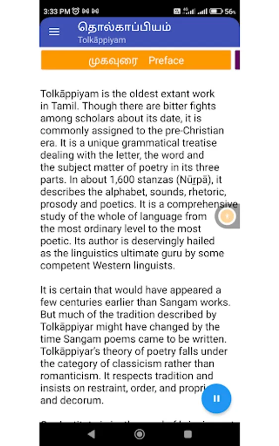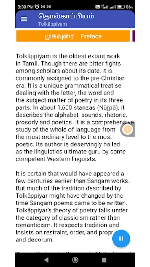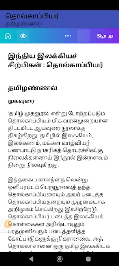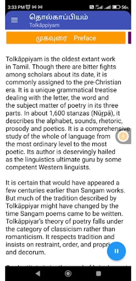 Tolkāppiyam in Tamil, dated not later than the third century before the advent of the Common Era, is, arguably, the earliest complete work of linguistics in the ancient classical traditions of the world. It is complete in the sense that it encompasses both the written and the spoken languages, and it is a grammar of graphology, phonology, syntax, semantics, poetics, prosody and rhetoric. As such, it marks a sui generis, towering presence without a comparable work in any of the primary classical languages of the world in range and perspective. This apart, Tolkāppiyam contains several concepts and ideas that are futuristic in content and spirit and several others that are pragmatic in character. It also embodies features which are in the nature of pioneering later developments in other languages and literatures, both classical and modern. It is no wonder then that Prof. A.L. Becker of the University of Michigan comments thus: “Tolkāppiyar was someone whose bust they should be putting in American university libraries”. Equally revealing is the observation of Prof. A.K. Ramanujan of the University of Chicago: “He is very close to what you would call a linguistics' ultimate guru”.