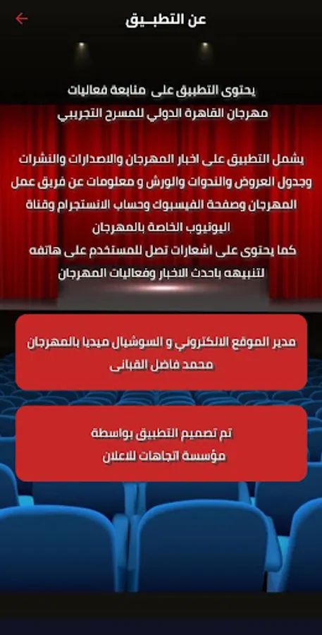 يشمل التطبيق على اخبار المهرجان والاصدارات والنشرات وجدول العروض والندوات والورش وصفحة الفيسبوك وحساب الانستجرام وقناة اليوتيوب الخاصة بالمهرجان كما يحتوى على اشعارات تصل للمستخدم علي هاتفه لتنبيهه باحدث الاخبار والفعاليات للمهرجان