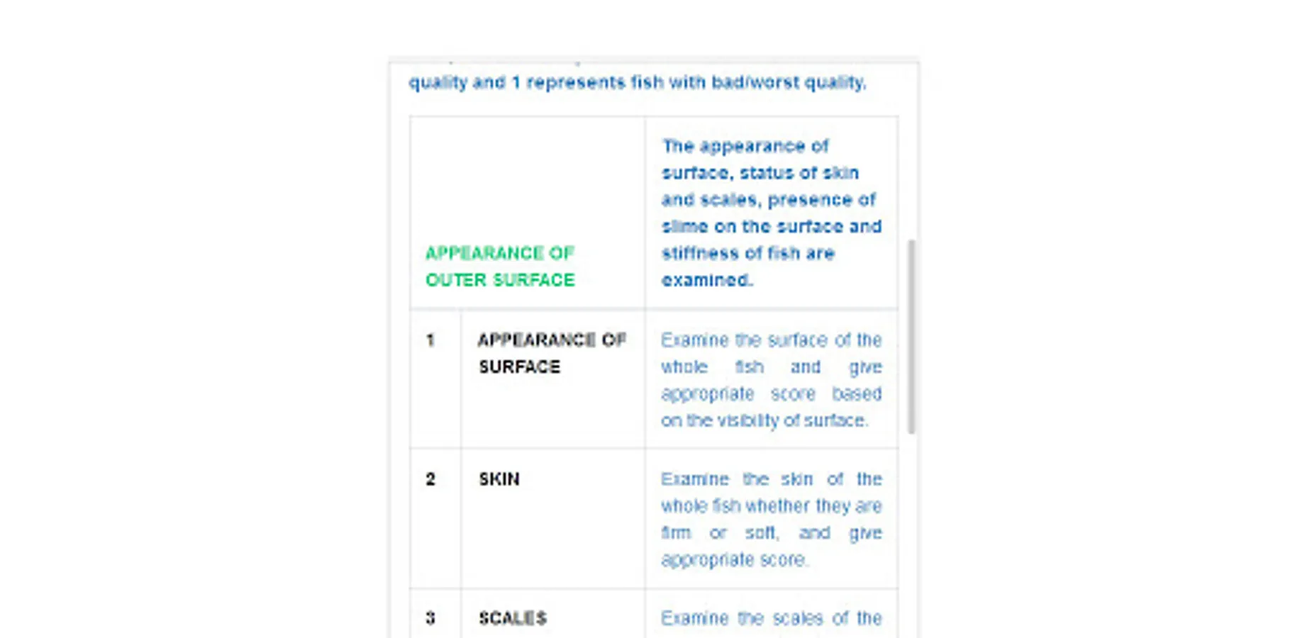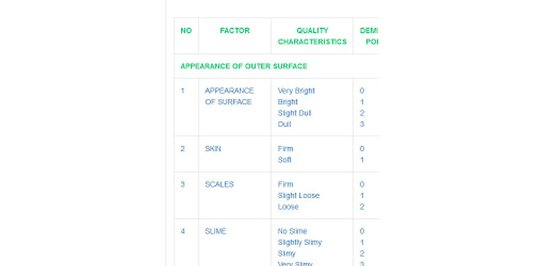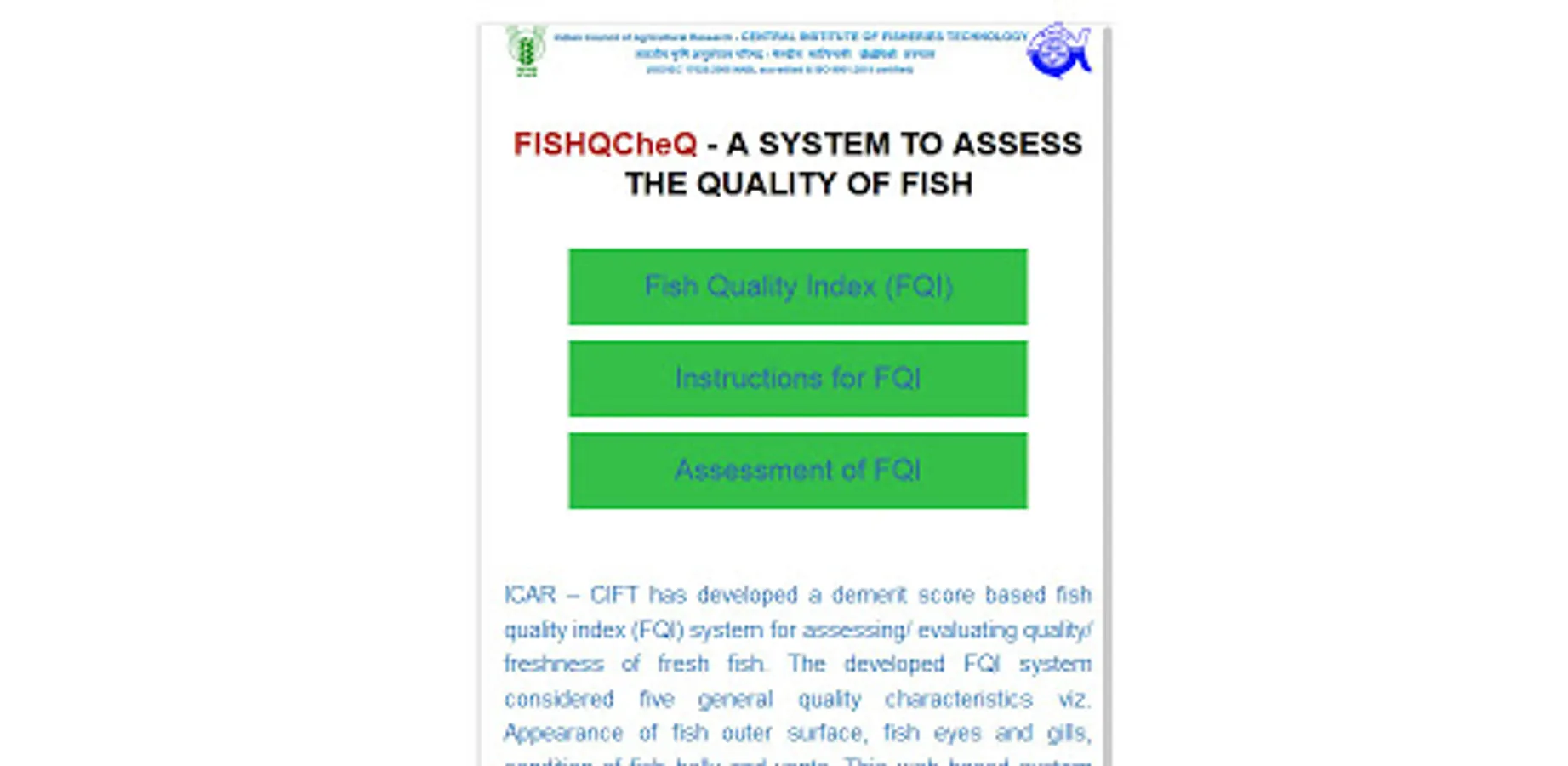 ICAR – CIFT has developed a demerit score based fish quality index (FQI) system for assessing/ evaluating quality/ freshness of fresh fish. The developed FQI system considered five general quality characteristics viz. Appearance of fish outer surface, fish eyes and gills, condition of fish belly and vents. This web based system would help the consumer to check/ evaluate the quality of fresh fish instantly. This system provides the instructions for evaluating the quality/ freshness of fish. After evaluating the fish in terms of quality characteristics description, the consumer or user has to select appropriate score given in the element score sheet. After complete selection of demerit score, a final fish quality index (FQI) would be computed automatically along with the quality description of fish.