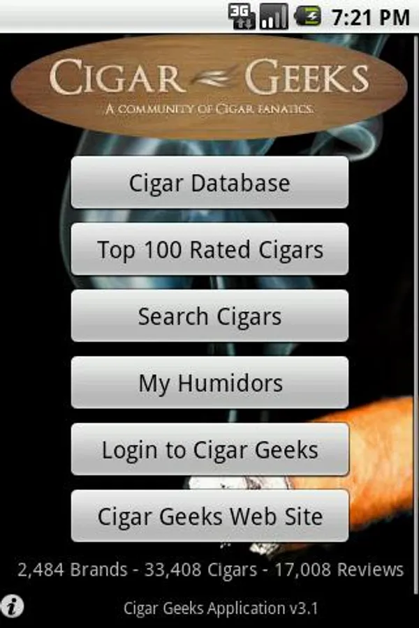 The Cigar Geeks application is for the cigar enthusiast who is interested in furthering their cigar hobby. It comes pre-loaded with a searchable database of over 51,000 cigars and over 32,000 cigar reviews. The app can download the latest Cigars and Reviews from the Cigar Geeks web site as they are updated.
