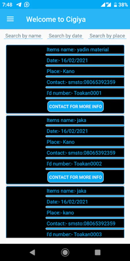 CIGIYA is a lost and found application that will facilitate the searching of lost items by people and help transport associations, media houses and other relevant organization to generate a database of lost item. This will enable individuals to use the application to search for possible found items and the location they were submitted. Most of the transports association having parks have a number of unclaimed lost items as a result of uncertainty of where the items are submitted. The announcement made in the media houses does not reach some people who lost their items as the announcement may happened when they are not on the tune and it is normally within short days. With the new CIGIYA app a permanent database of lost items will be available online and people can search it any time by item type, date range or car park or stations. The data base will simply be generated by the representative of agreed park, media house or unions.
