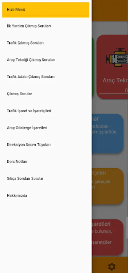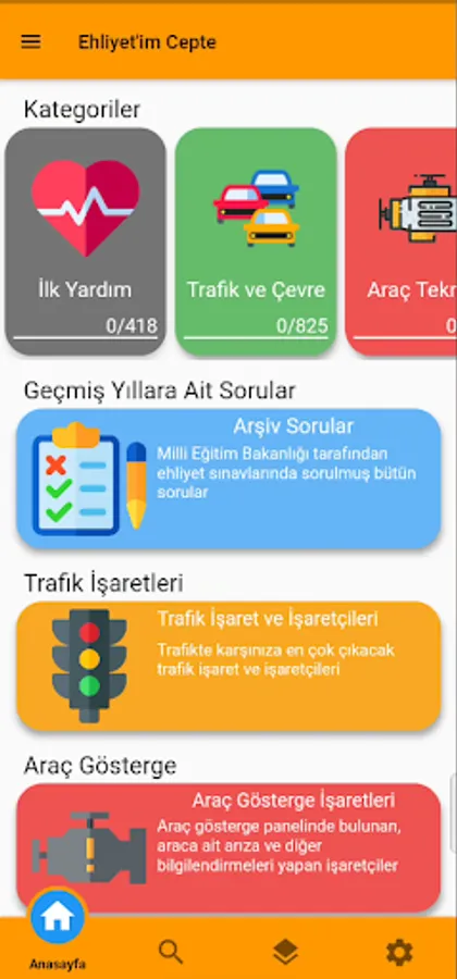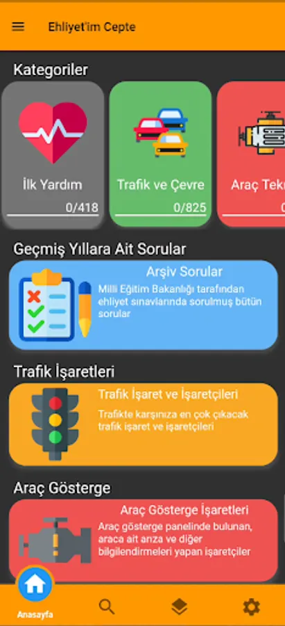 You can find all of the questions previously asked by the Ministry of National Education from within the application, as well as about two thousand questions separated by category. You can also access annotated traffic signs and markers, vehicle indicator signs.