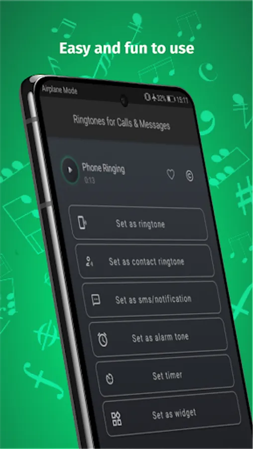In this personalization app you will find the most popular ringtones, music and sounds. Choose between music ringtones, perfect to use for incoming call ringtone, or shorts SMS sounds that are perfect for all kind of notification ringtones.