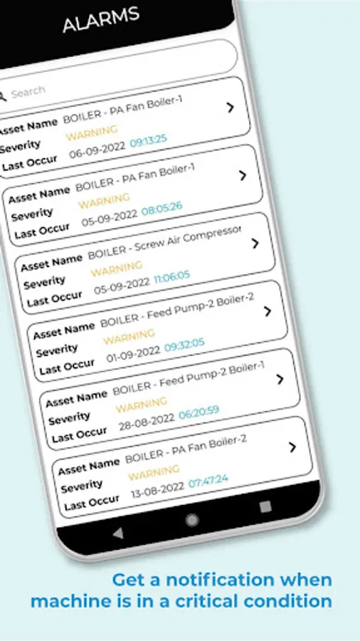An alarm list and alarm detail gives a list of all the updates of each sensor on each asset. Each alarm is curated carefully to exactly describe what is the condition of the asset, whether it is in a warning state or critical state. In addition, VIBit push notifications that will keep updating its users about the conditions of the machines.