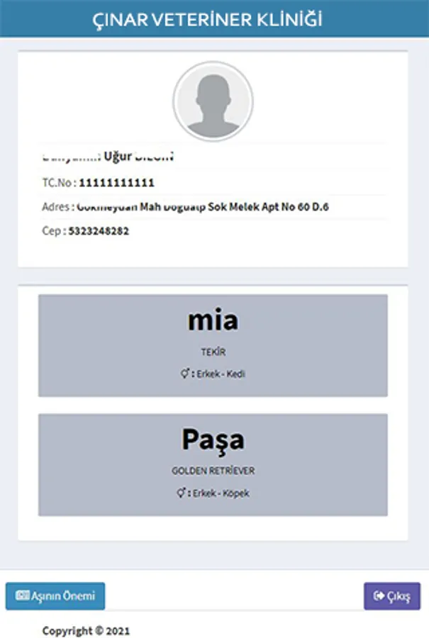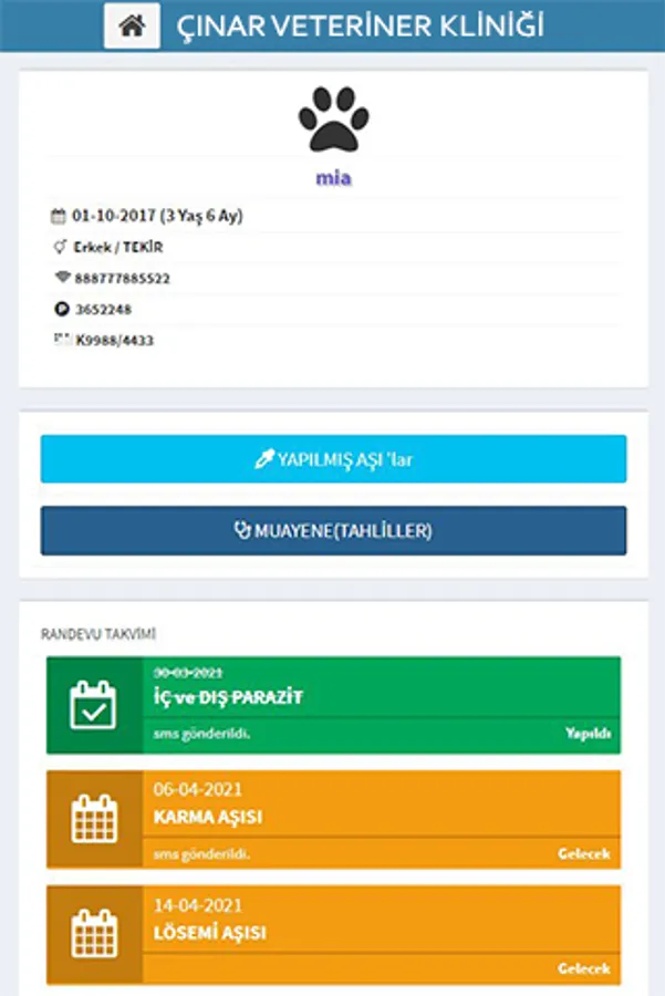 Çınar Veterinary Clinic patient / vaccine follow-up program (Only registered patients in our clinic can use it).