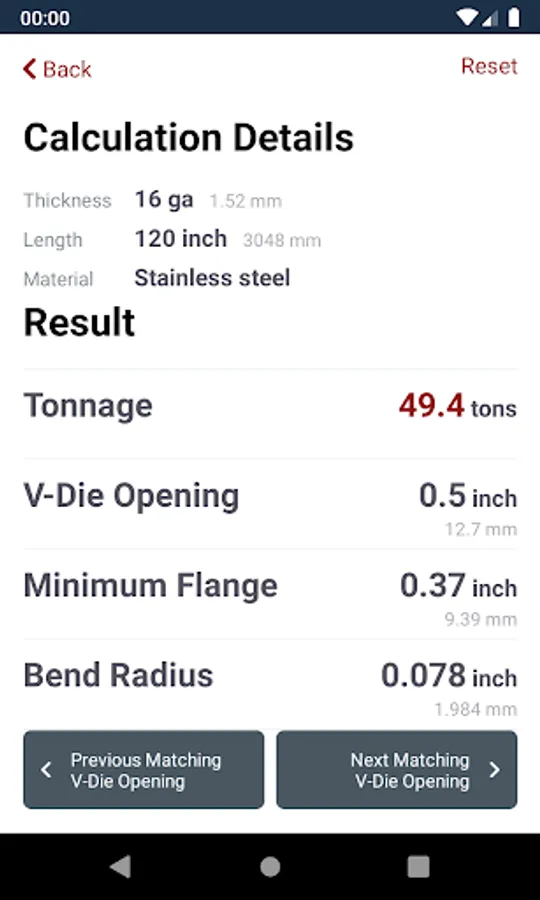 The CINCINNATI Load Calc app is a must tool for any metal fabricator to calculate the air bend tonnage to form a part on a any brand press brake. The intuitive interface will guide the user through the process by allowing selection of material type, material thickness, and vee die opening. From these parameters, a tonnage will be calculated along with the minimum flange length and inside bend radius.