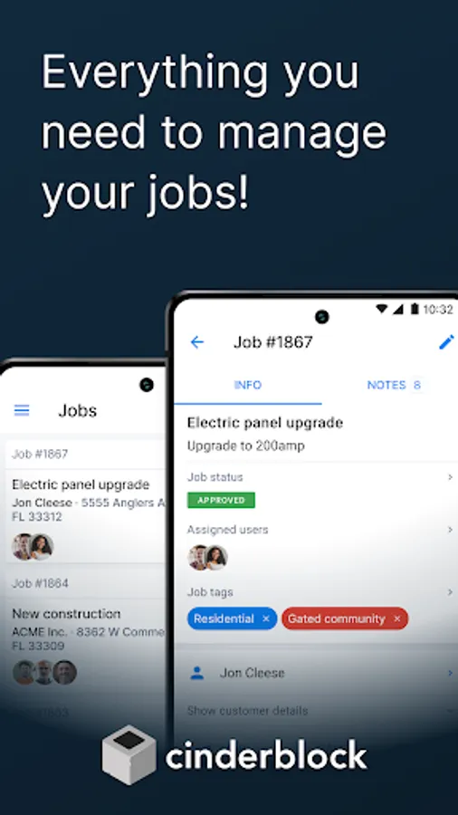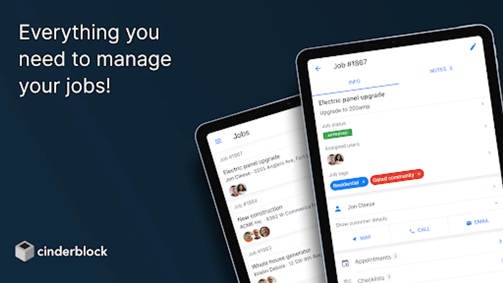 With Cinderblock you can manage your jobs, customers, and employees. Allowing you to stay organized, win more bids, and provided customer service which is a cut above the rest.