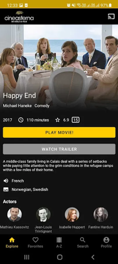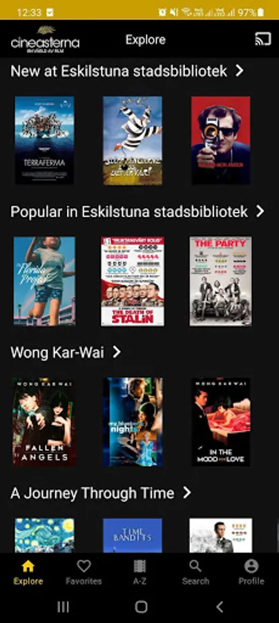 With Cineasternas app for Android, you can watch more than 3,000 films from 82 countries in 52 different languages directly on your device. New movies are added continuously. You can explore our movies by scrolling from A-Z, filtering titles based on genre, year, IMDB rating and language. Are you looking for a specific movie, actor or director? No problem, use our search tool where you can also search by country. Explore movies through our inspiring themes and lists or build your personal movie library with the favorite function. You can watch the movies directly on your device or on your TV using our Chromecast feature. You can borrow the films as a logged in user or with your library card.