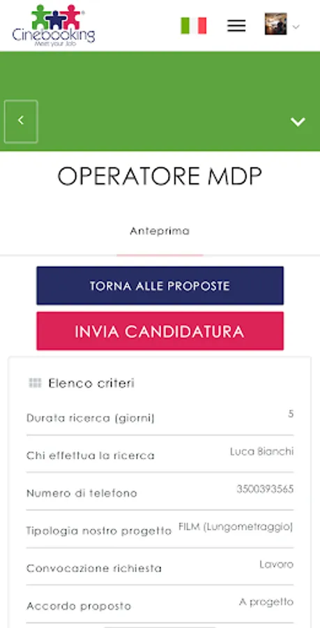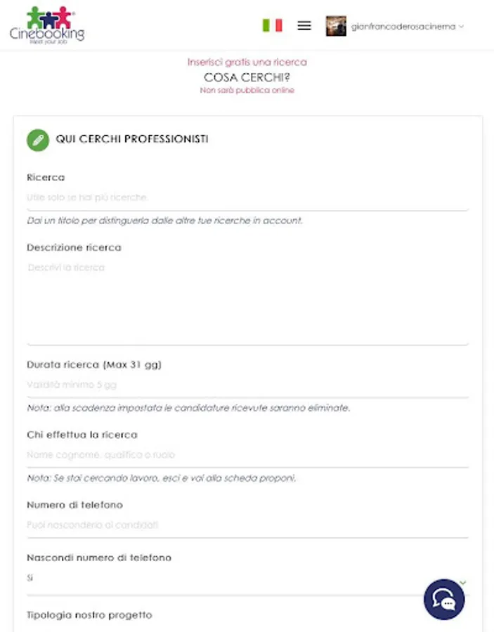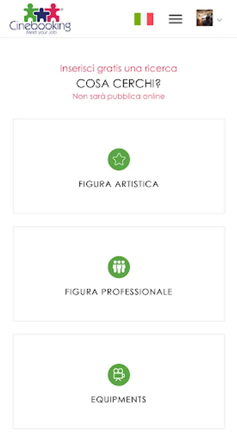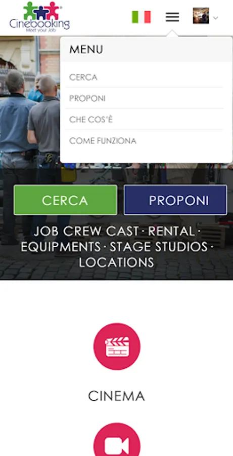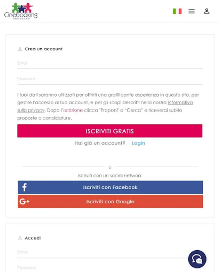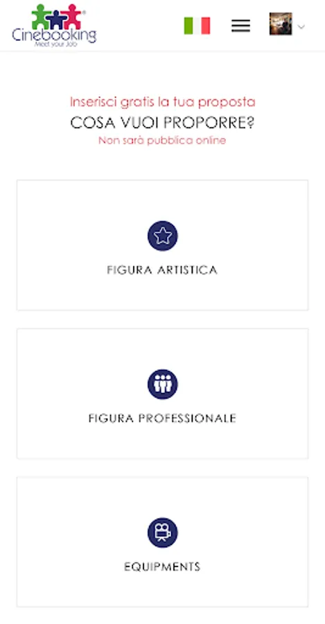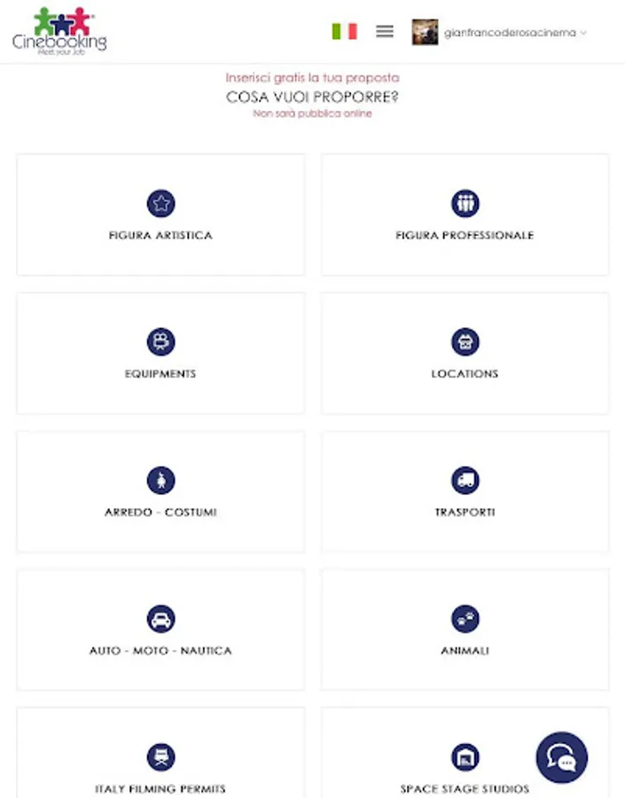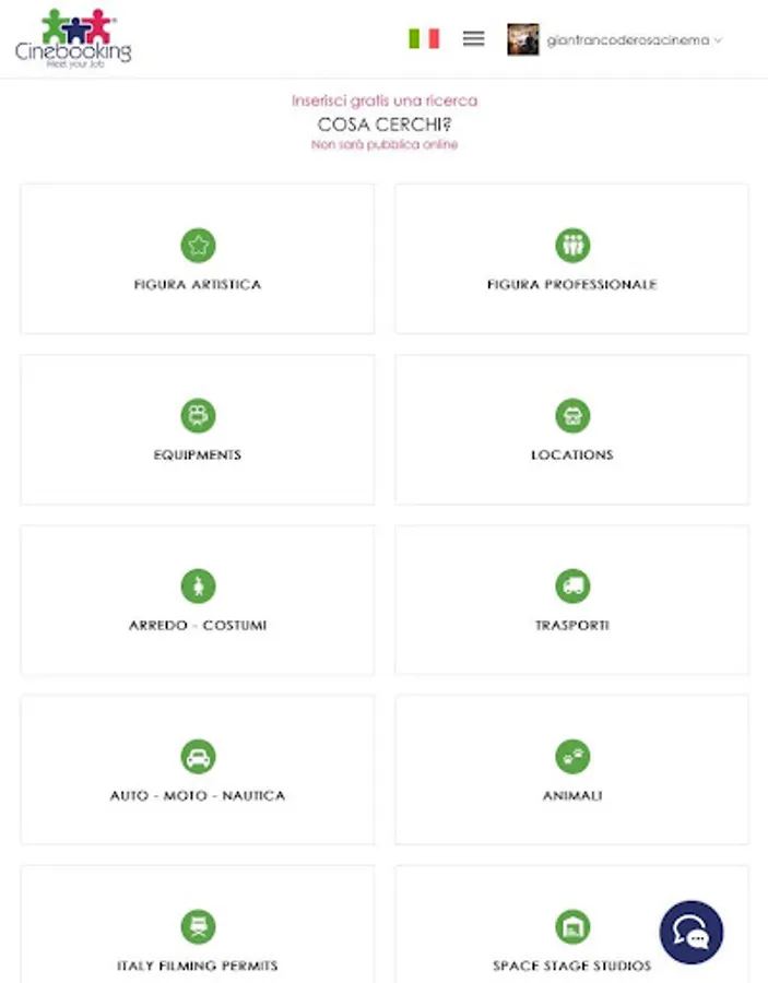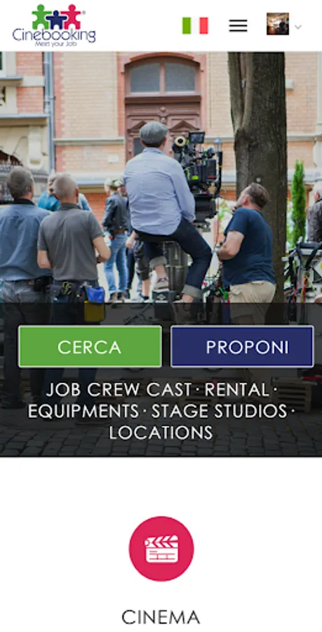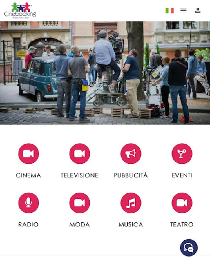Cinebooking is a platform that facilitates the meeting between supply and demand of professional figures, artistic figures, structures and supplies used in the industries of Cinema, Television, Advertising, Events, Radio, Fashion, Music, Theater that, with an exclusive "match" algorithm that allows with a single solution to start a multiple search of candidates and supplies available for qualification, date, place, best cost and payment conditions offered.