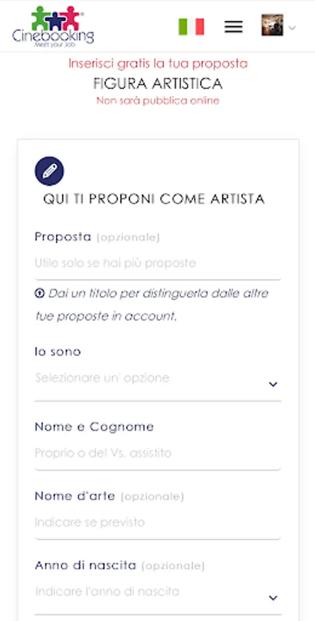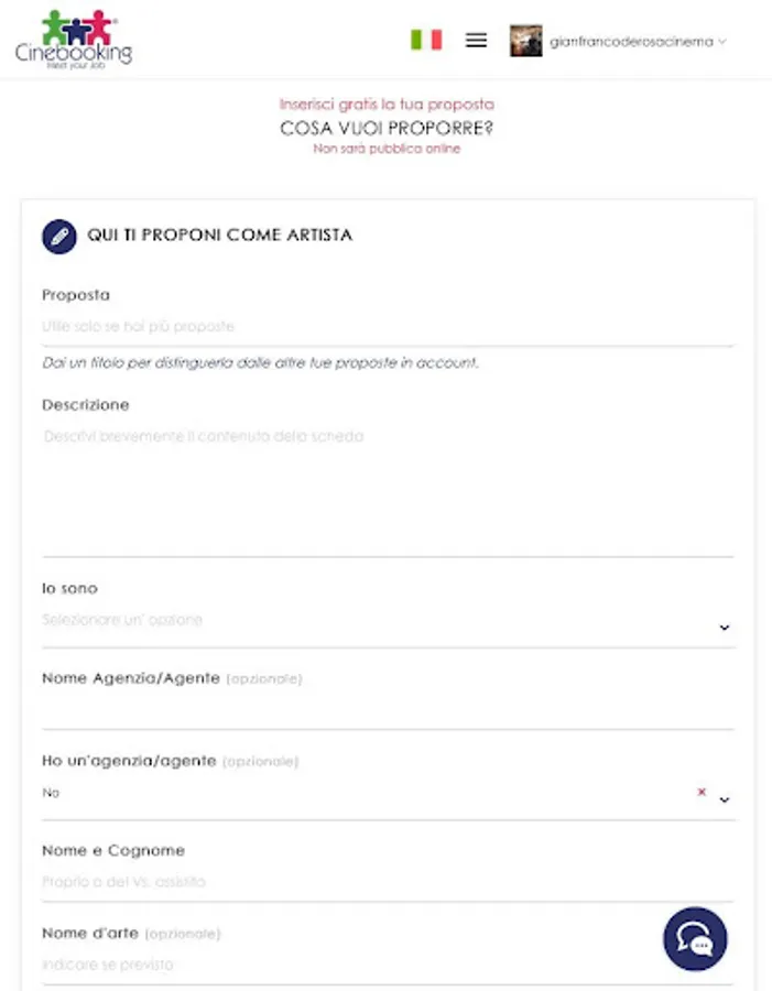 SIMPLE and INTUITIVE , only a quick registration is needed, by entering email and password, or via social, to proceed to fill out the form, selecting SEARCH or PROPOSAL depending on which of the 'interest in seeking or proposing a technical or artistic resource among those listed.