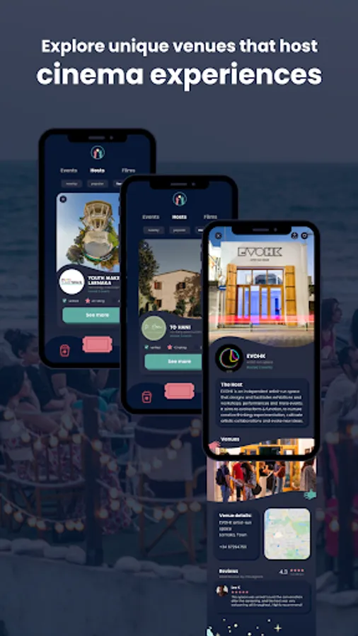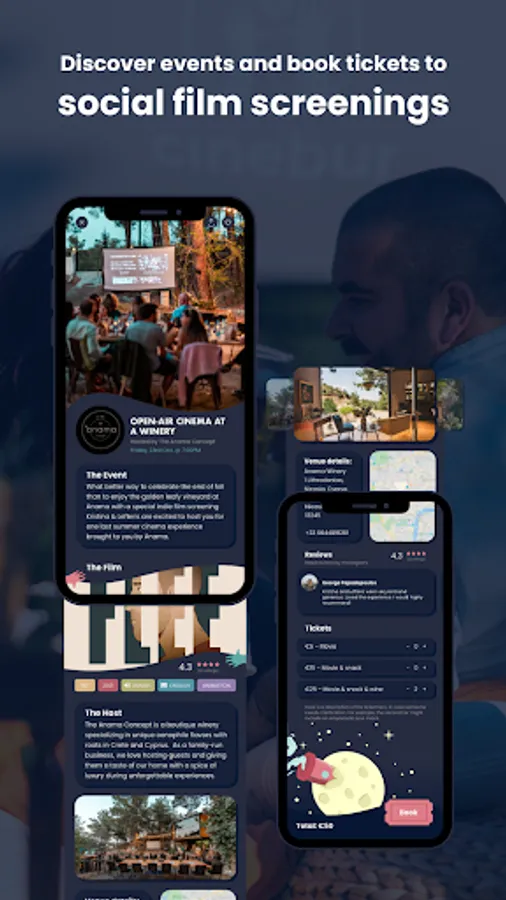 Every event on Cinebur is organized by a member of our passionate community of Host partners, offering a near-infinite variety of screenings, themes, venues, and creative visions. Cinebur moviegoers attend events in wineries, boutique hotels, artistic spaces, museums, cafés and rooftop bars, community spaces, and many more diverse venues.