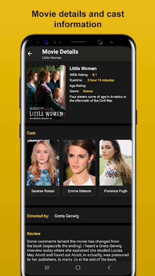 - All kind of information about the movie such as cast, plot, movie ratings, runtime and more in-depth details.