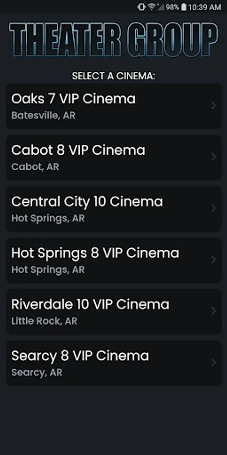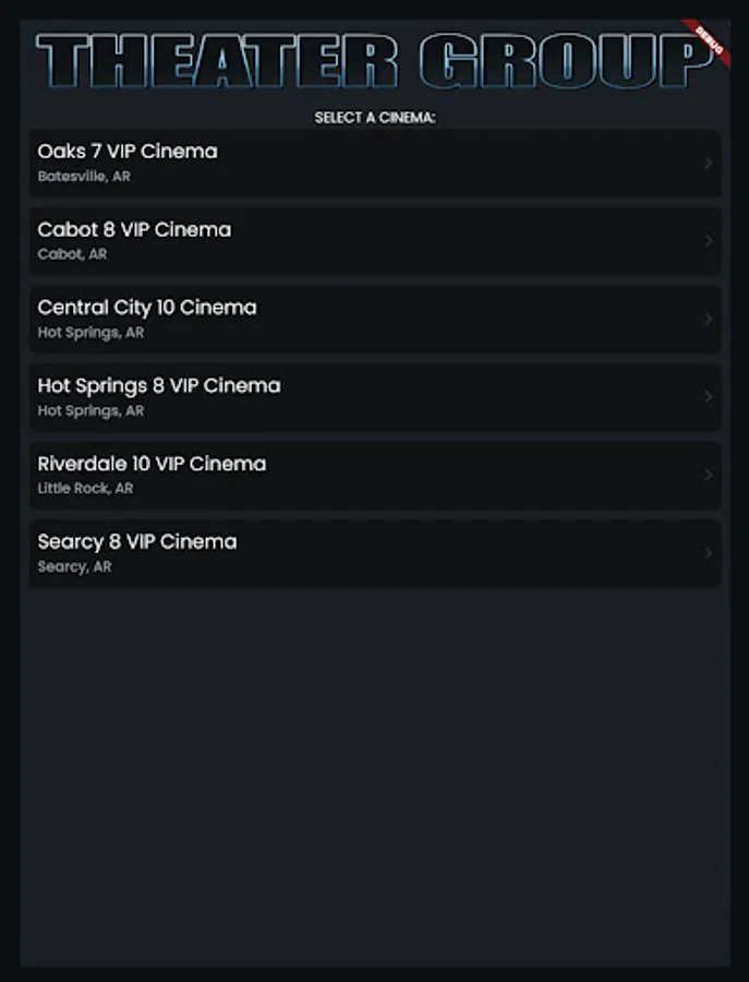 The official showtimes app for Theater Group, Inc. which operates Searcy Cinema (Searcy, AR), Silver Screen Cinema 8 (Cabot, AR), Hot Springs Mall Cinema (Hot Springs, AR) and Riverdale 10 Cinema (Little Rock, AR). Receive showtimes, upcoming release information and special announcements only available to our APP users!