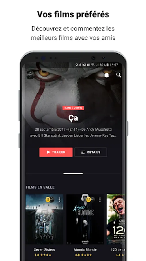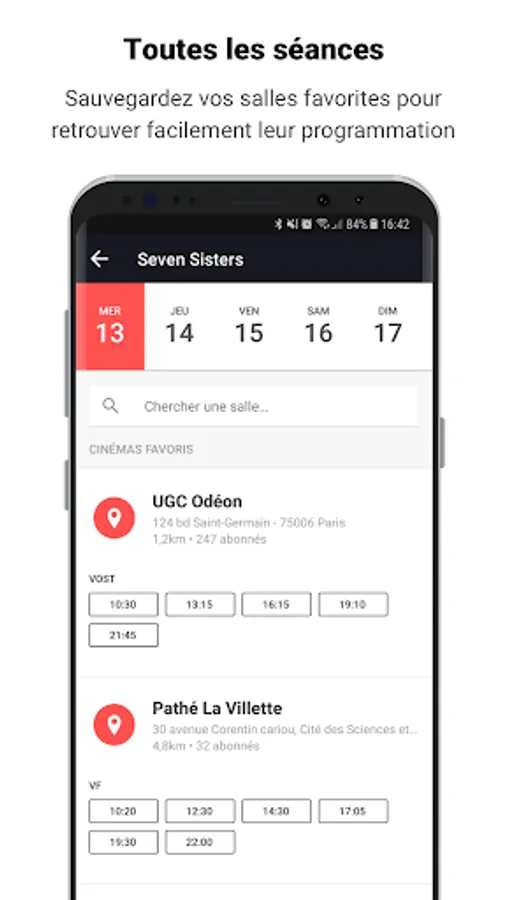 - Easily review all cinema sessions in your favorite rooms and in the nearest cinemas (Pathé, Gaumont, UGC, MK2, CGR, Cinéville Mégarama, Kinepolis ...)