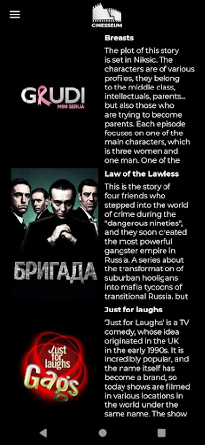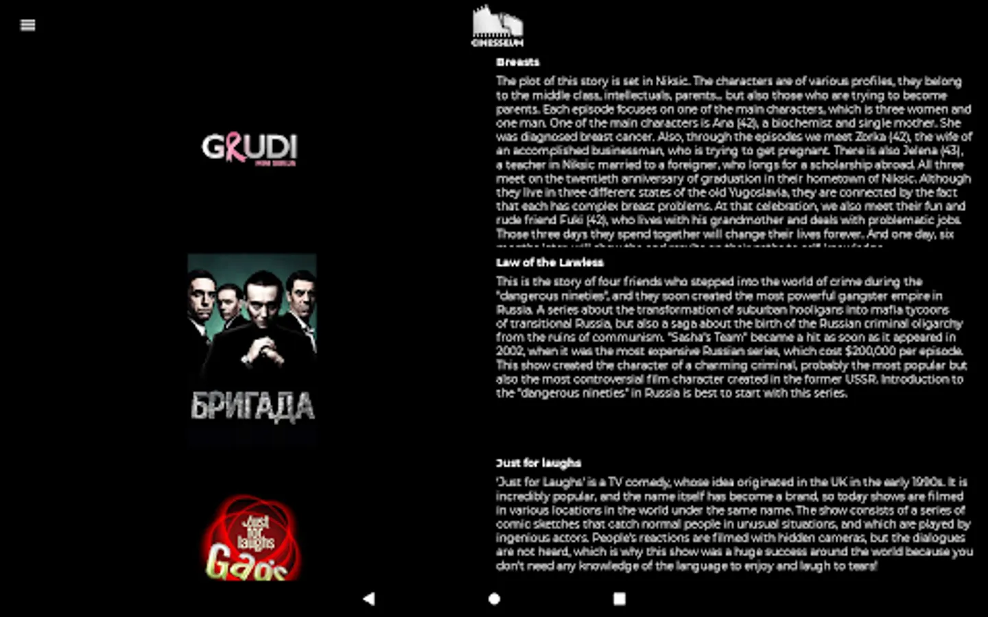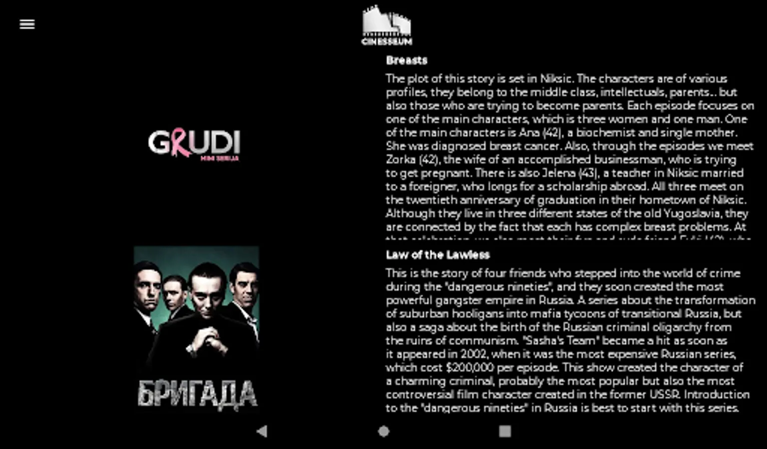 Cinesseum is the first and only legal SVOD platform for watching ex-yu movies, series and podcasts online. The platform offers an opportunity to all people around the world to legally enjoy movies and other interesting video content. Cinesseum is like a buffet of video content. It currently offers more than 500 movie titles: blockbusters and classical masterpieces, with continuously growing catalog. Content is always available, one click away from you. It is "ad-free" and offered at very affordable monthly subscription price.
