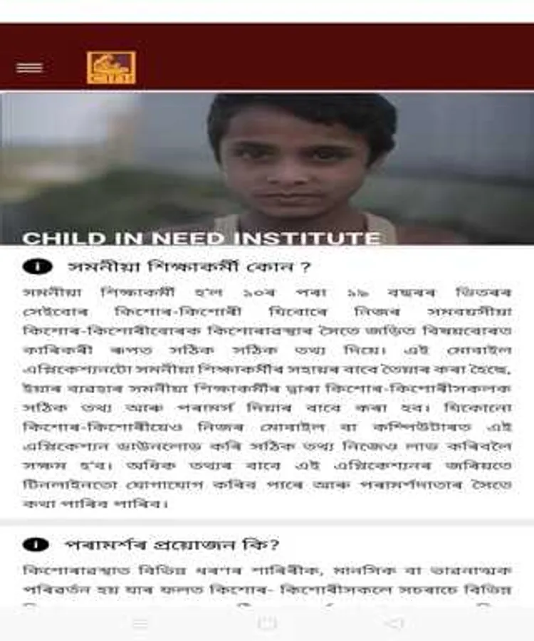 Kishore Kishori Bandhu is developed by Child in Need Institute (CINI). The app aims to disseminate accurate information on the themes- Nutrition, Sexual and Reproductive Health, Non Communicable Diseases, Mental Health, Substance Misuse, Injuries and Violence among adolescents of Assam. Through the app CINI attempts to reach out to adolescents of vulnerable communities of Assam.