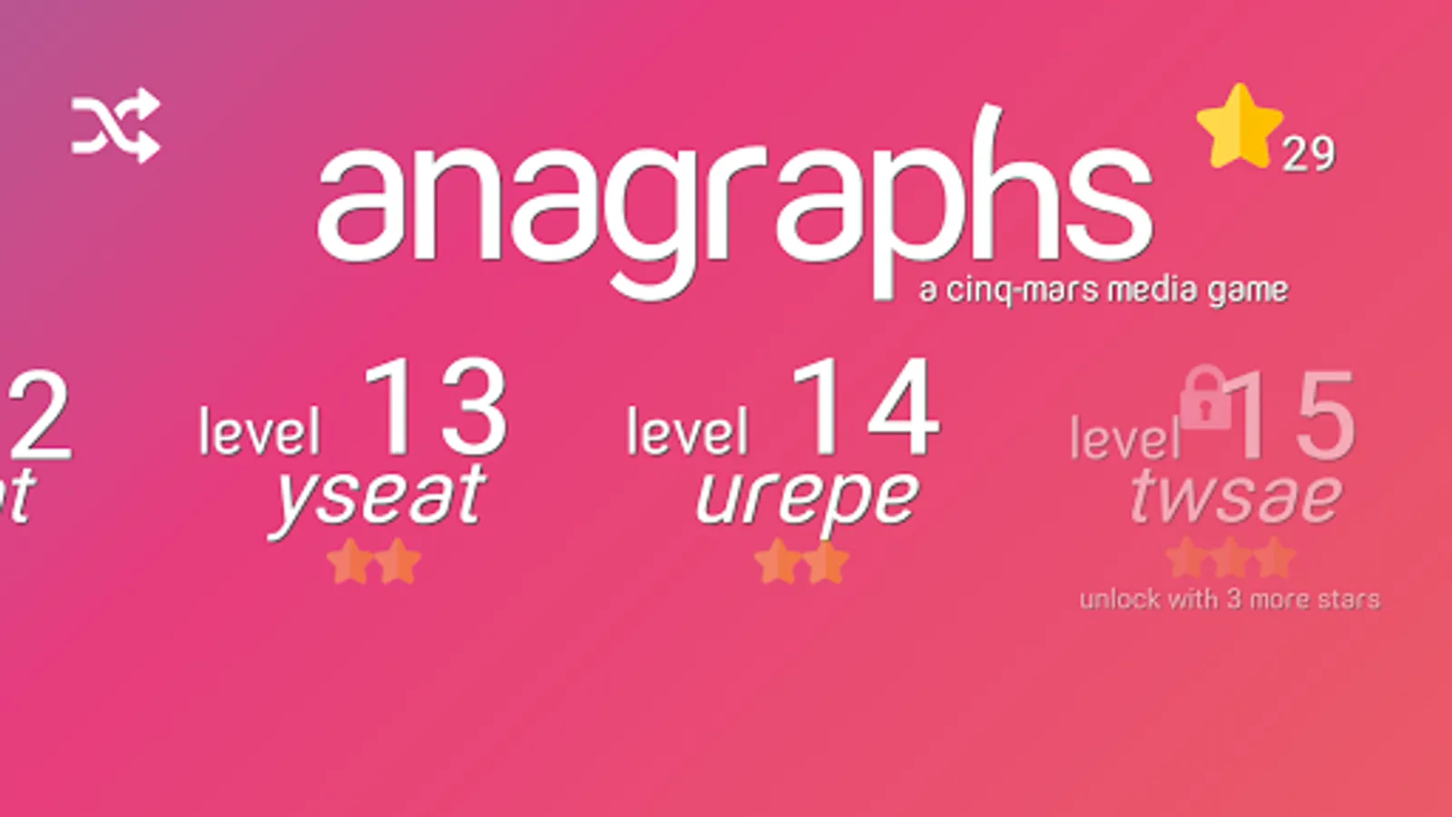 Built with a specially designed font with several characters that can be rotated in such a way, Anagraphs is a challenging linguistic puzzle where you must optimize paths to earn stars used to unlock new levels. Anagraphs is a spiritual successor to the popular word game, Synonymy.