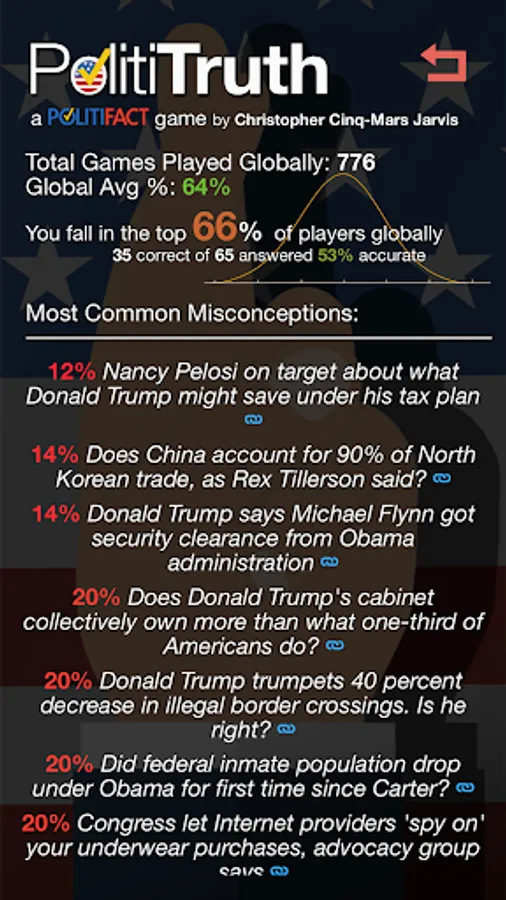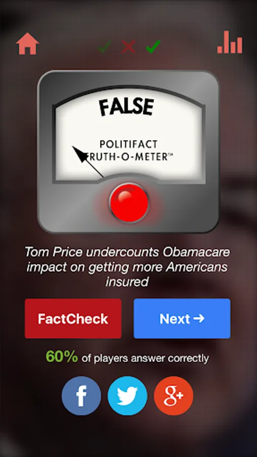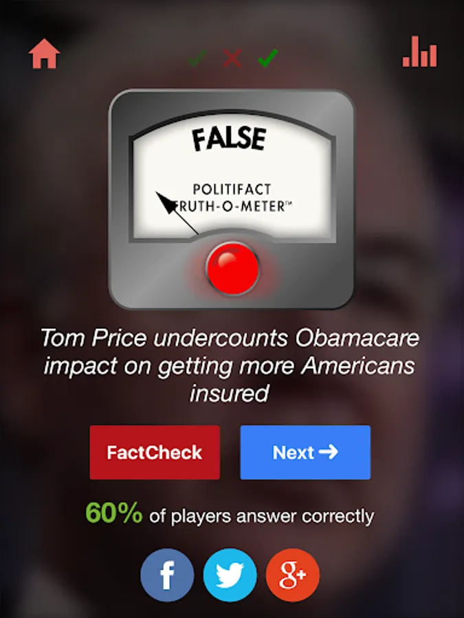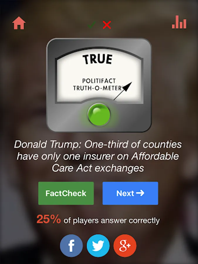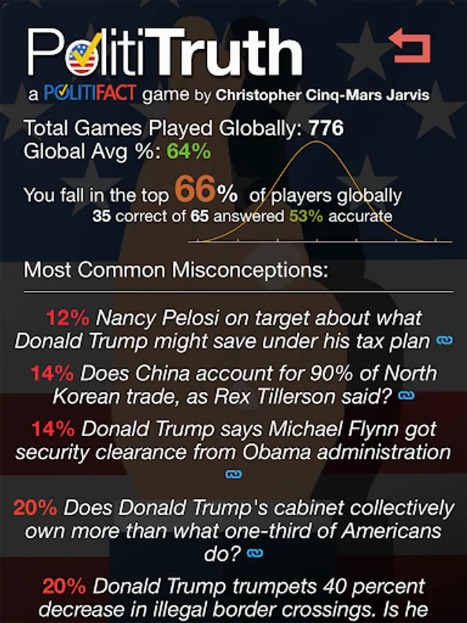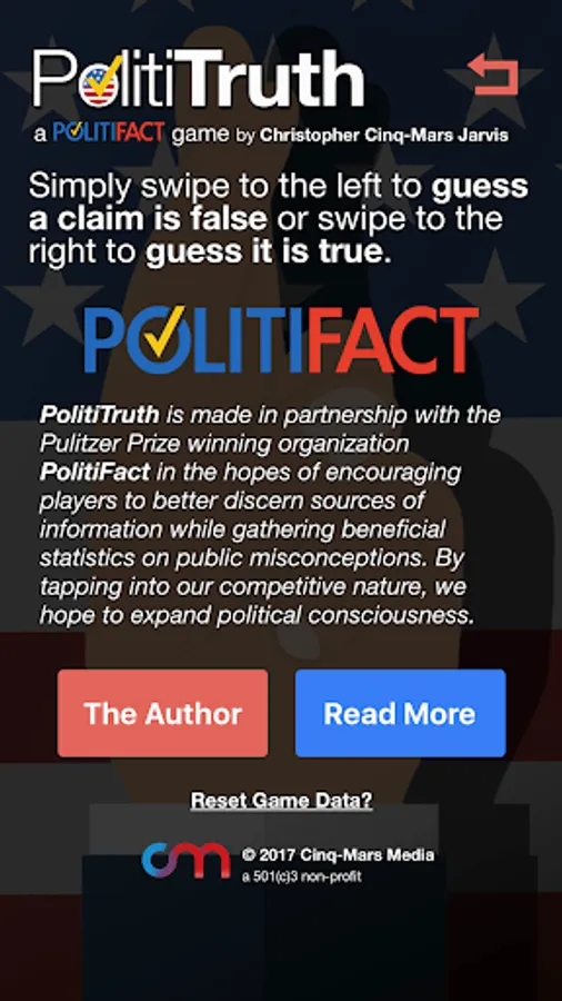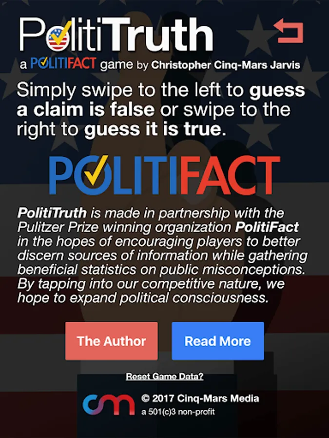 Swipe left to guess a news story is false and swipe right to guess it is true. The game is made in partnership with the Pulitzer Prize winning organization PolitiFact in the hopes of encouraging players to better discern sources of information while gathering beneficial statistics on public misconceptions. By tapping into our competitive nature, we hope to expand political consciousness.