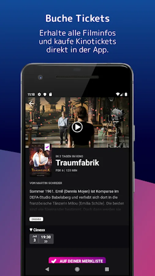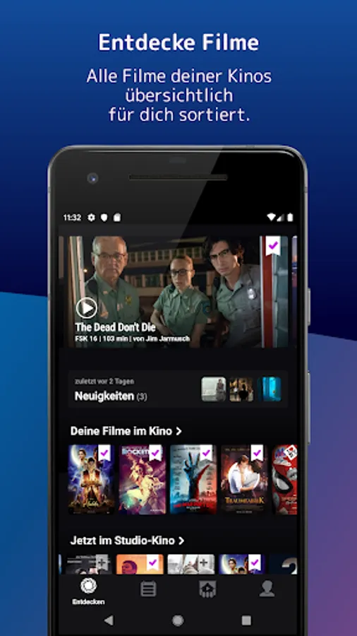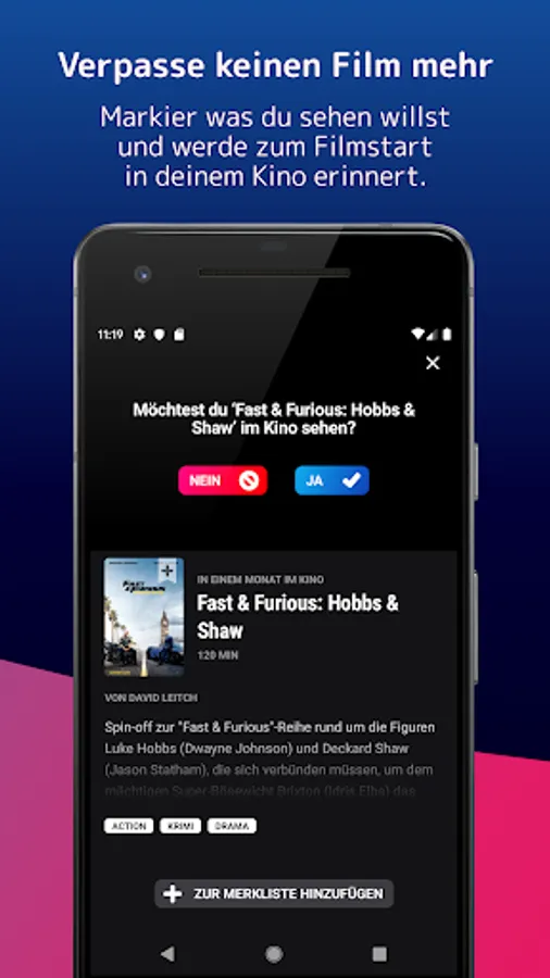 Put films that interest you on your watchlist. Let yourself be reminded at the start of the film and never miss a film in the cinema again!