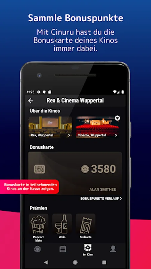 In selected cinemas, you can collect bonus points with every visit to the cinema. Simply show Cinuru at the cash register and have the QR code scanned. With your bonus points you can be rewarded with valuable rewards for your loyalty. Receive for example popcorn, nachos, soft drinks or free tickets. You can find a precise overview of your cinema premiums in the app.