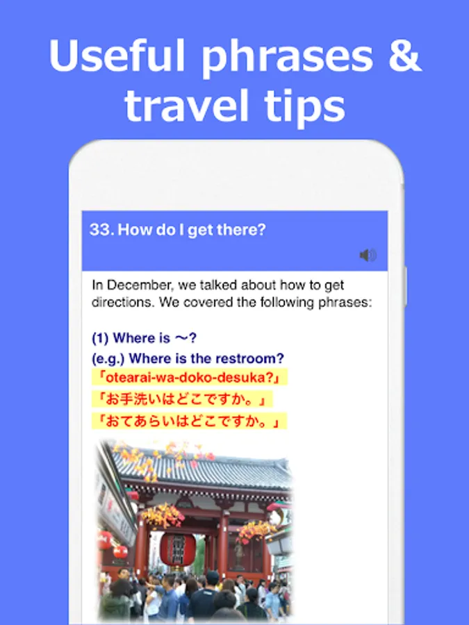 ■ Native Japanese speakers’ voices are available for all the phrases in the app.