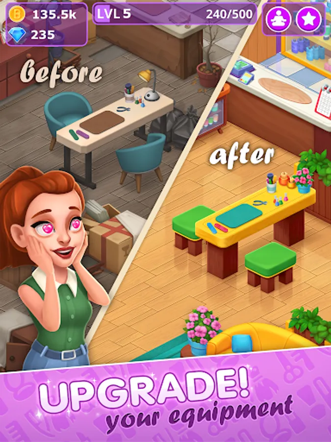 Beauty hair salon, nail spa salon, and makeup salon game – all these you will find in our Idle Beauty Tycoon! With idle makeover salon management, you will have fast progress. And you will be fully captivated by the atmosphere and the plot our free hair salon game have to offer you!