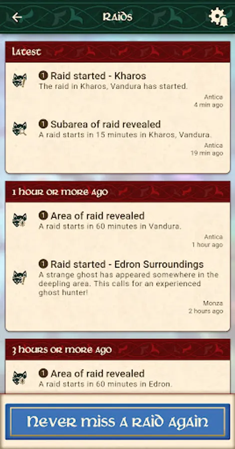 NEVER MISS A RAID: Always be informed about upcoming and ongoing raids for all of your characters. Define areas you want to track and receive push notifications right when the action starts.