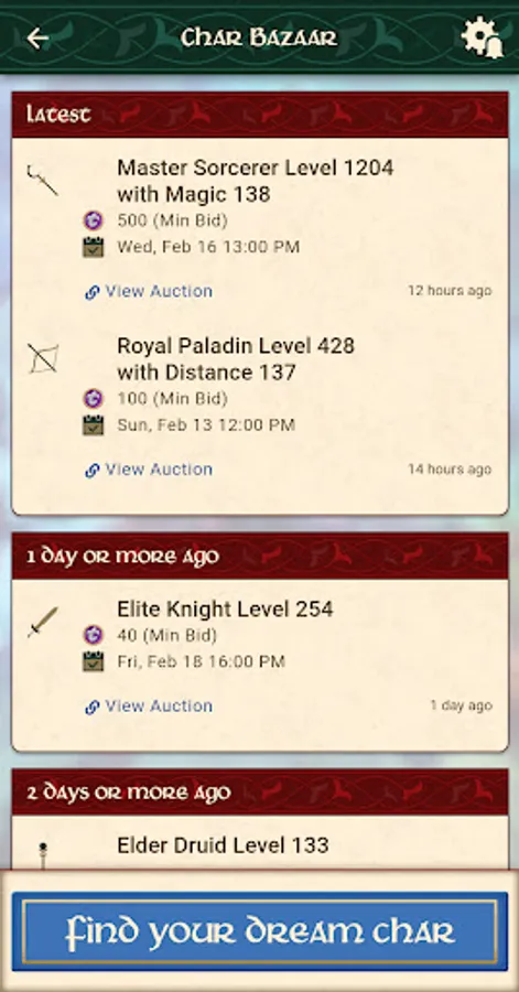FIND YOUR DREAM CHARACTER: Tell the app what characters you are interested in and receive notifications when they are up for auction in the Char Bazaar. Select filters for game world and type, level, vocation and skill.