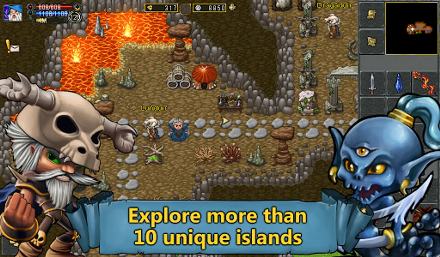 Roam freely on the islands Aurea and Lybera. Buy access to additional islands or purchase Premium Time to explore every corner of the 2D MMO world.