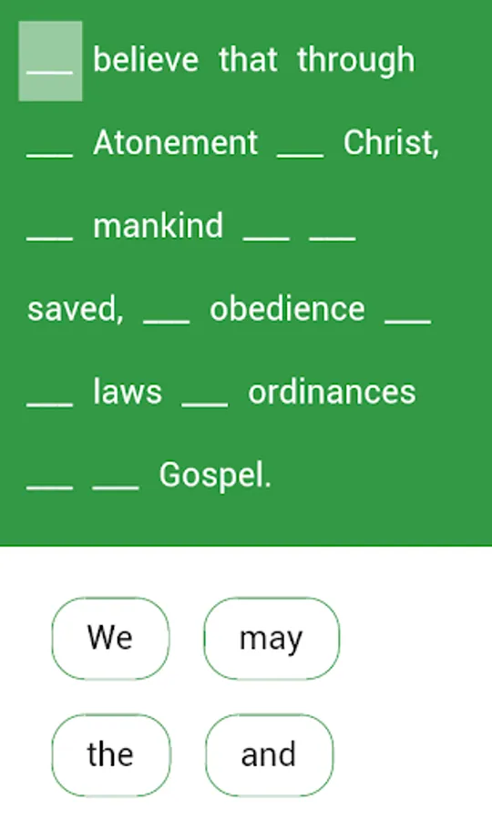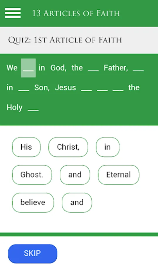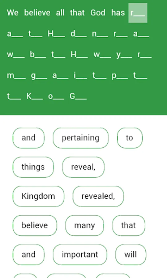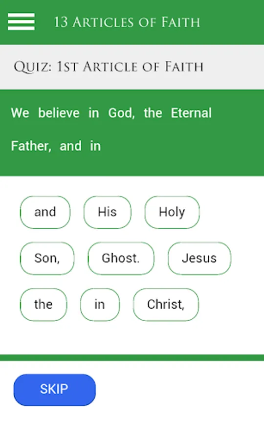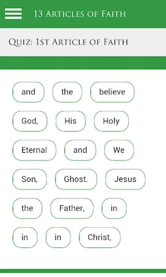 An easy to use tool to view, learn or memorize or rememorize all 13 Articles of Faith of the Church of Jesus Christ of Latter-Day Saints. Review the Mormon articles of faith in a clean list, and quiz yourself on each of them in multiple ways. The quiz presents the words from each article of faith in a scrambled order, you just tap the words in the correct order. Many different levels: all words scrambled, a random set of half the words scrambled, only long words or short words scrambled, all words with a first letter displayed as a hint... etc. Suggest more levels if you can think of them. This is a great Sunday app for primary kids, youth and adults.